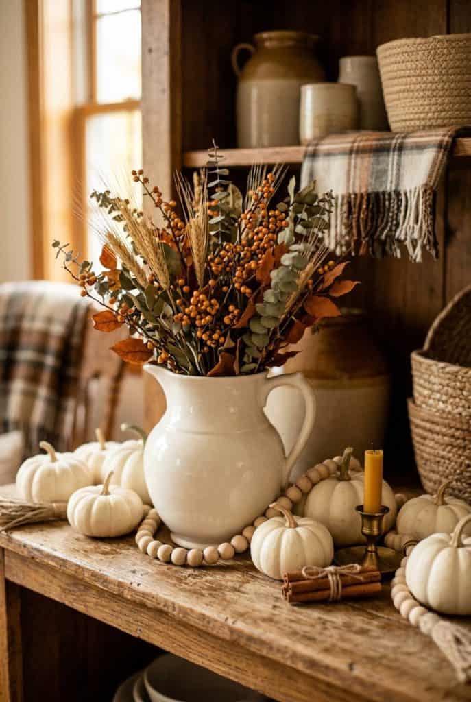 Arrange an ironstone pitcher, a few white gourds, and a draped wood bead garland on a hutch shelf. This neutral setup fits right in with farmhouse or modern styles.