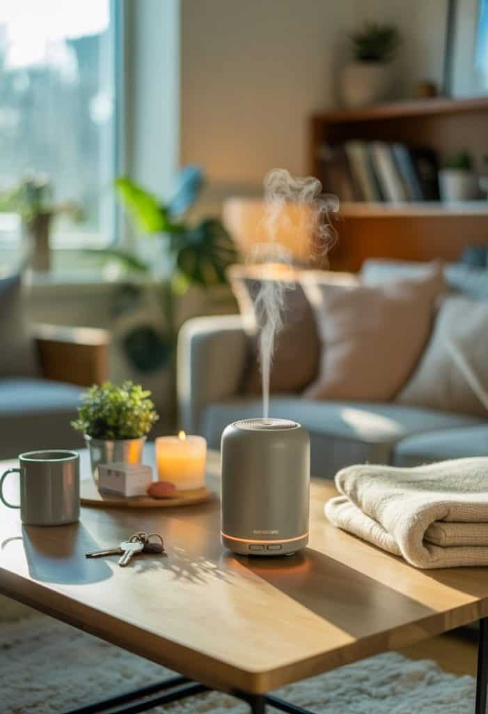 An essential oil diffuser makes your place smell great without fire hazards. It’s safer than candles and doesn’t fill the air with weird chemicals.