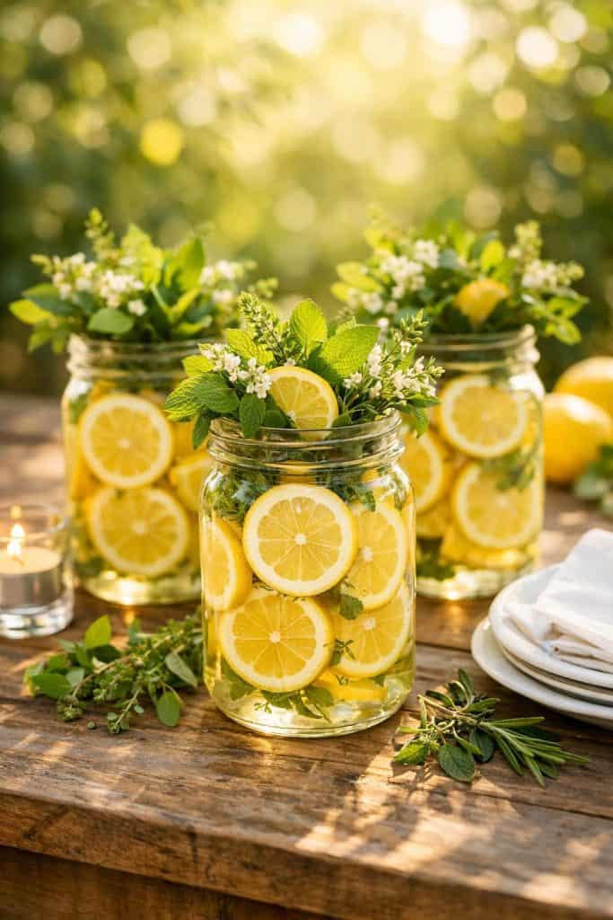 1. Lemon and greenery mason jar centerpieces