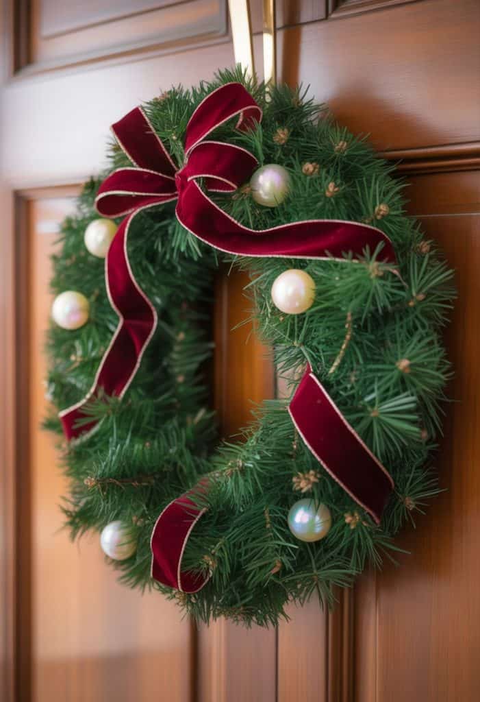 10. Luxurious Wreath with Velvet Ribbon and Pearls