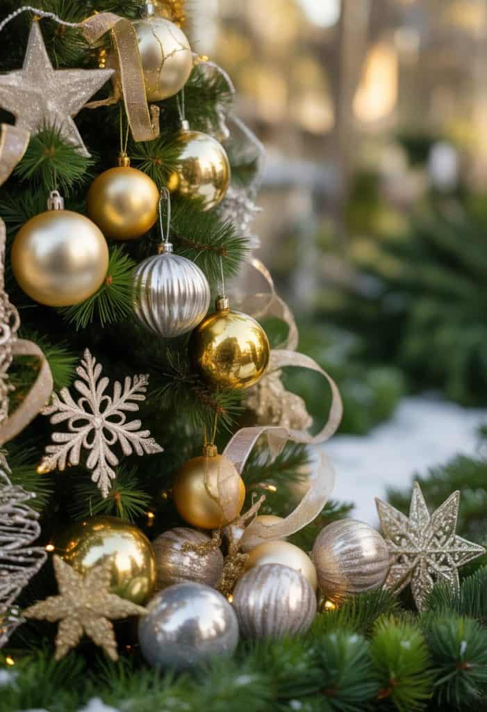 Gold and silver ornaments outdoors look stunning and catch the light beautifully. Hang large weatherproof ornaments from your porch ceiling or tree branches.