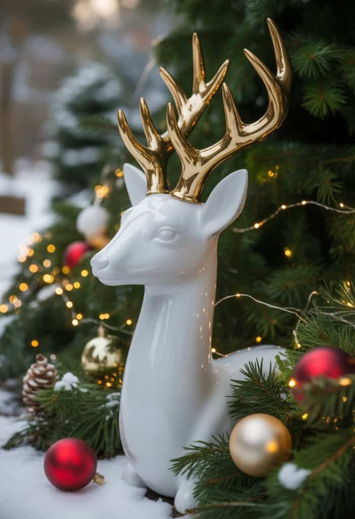 White ceramic deer with gold accents bring a touch of elegance to your outdoor display. These figurines look great on porches, patios, or tucked into garden beds.