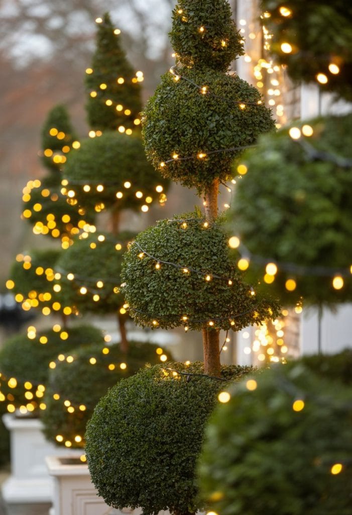 Topiary trees wrapped in twinkling warm lights look instantly elegant. These shaped trees bring a refined touch to your porch or garden.