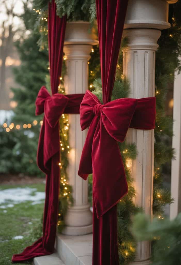 Wrap porch pillars with rich velvet ribbon for a dramatic holiday statement. Deep red or gold velvet feels especially festive.