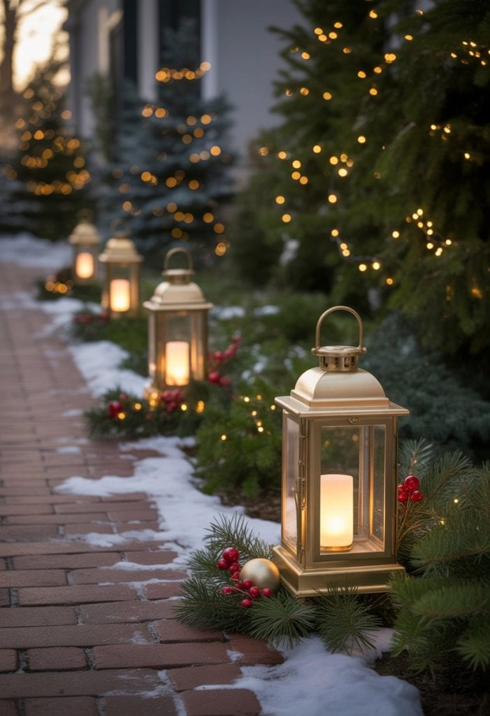 Brass lantern pathway lights add a touch of elegance to your walkway. Their warm golden glow welcomes guests and looks so cozy.