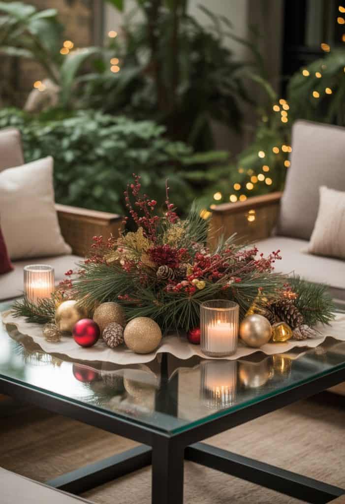 19. Glass-Topped Outdoor Table with Holiday Centerpiece