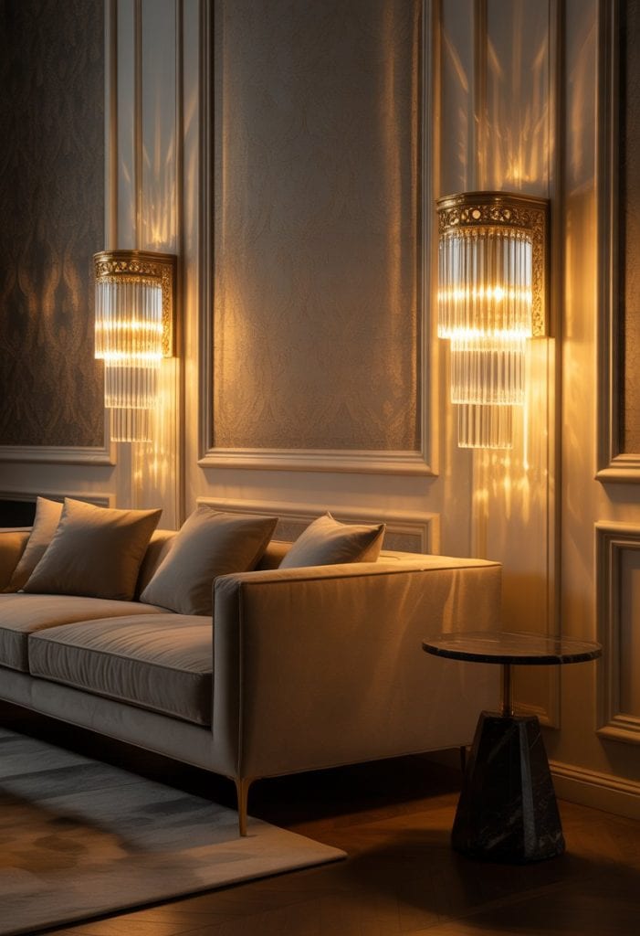 Crystal wall sconces instantly elevate your living room. These fixtures bounce light around in beautiful ways.