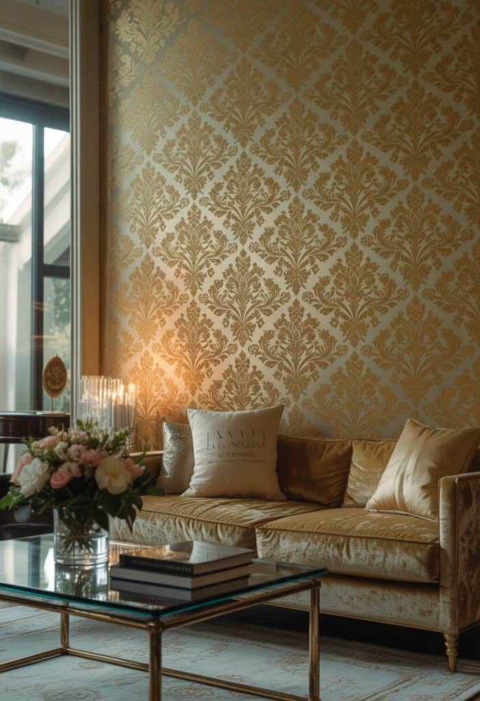 Damask wallpaper brings a touch of elegance to your living room. The intricate patterns make a sophisticated statement.