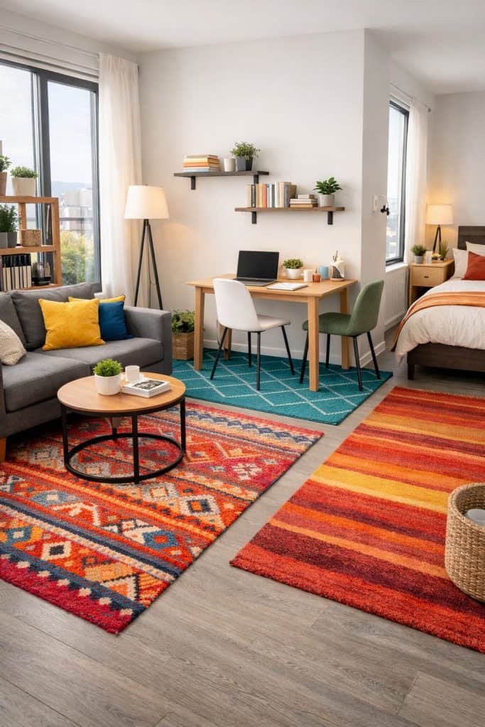 A bright rug can split up your studio into different areas, even if you don’t have any walls. Try tossing one under your bed to carve out a spot to sleep.
