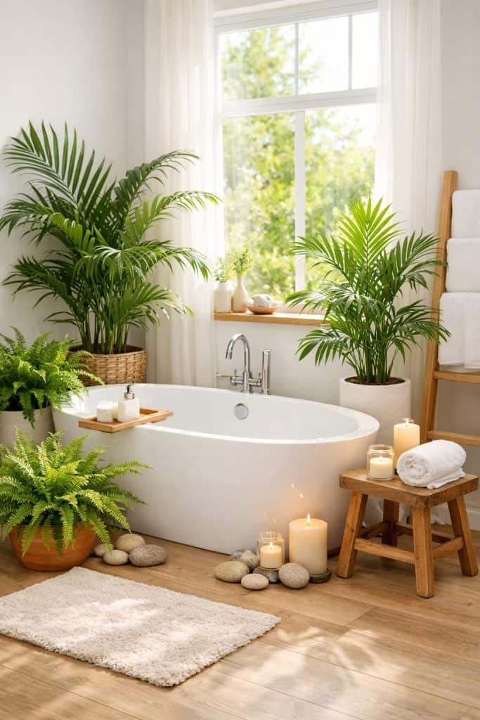 Set a potted palm near the tub for that resort feel. Ferns look great on shelves or in hanging planters.