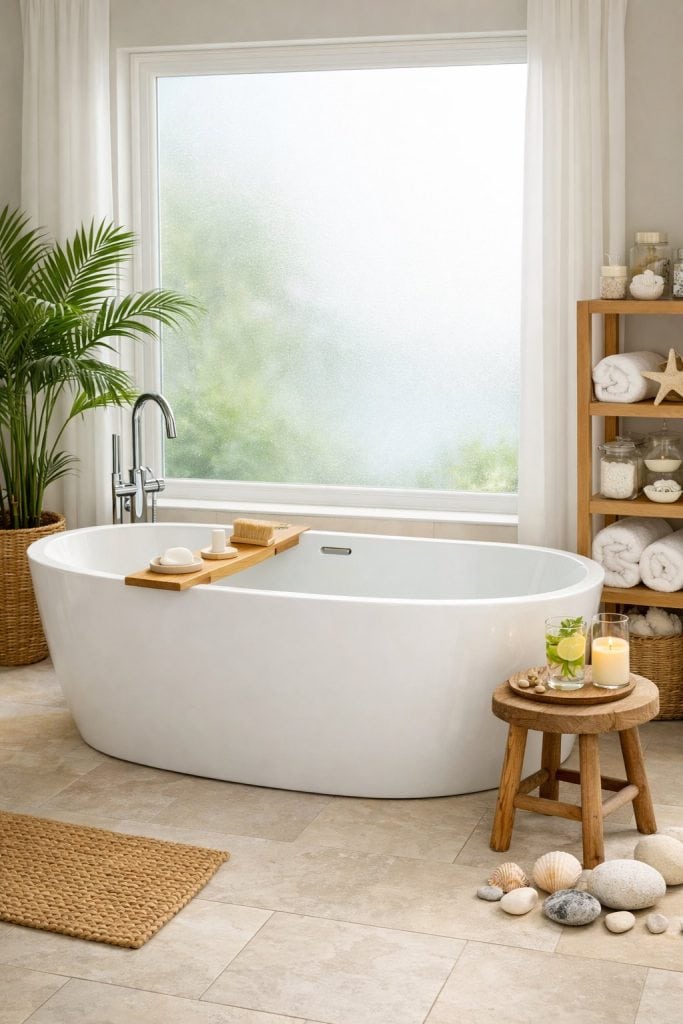 Sheer white panels let sunlight filter in while still keeping things private. They create a soft, airy mood that feels perfect for a spa bathroom.