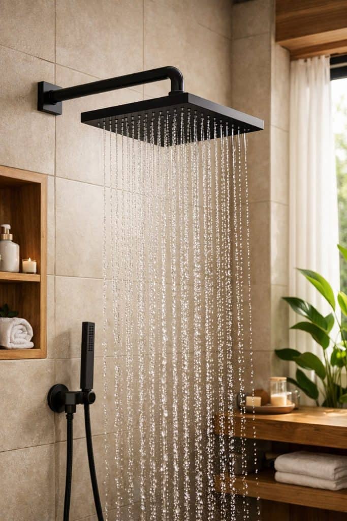 A matte black rain shower head instantly gives your summer bathroom some bold style. That dark finish really pops against light tiles or plain white walls, and honestly, it just feels a bit like a spa.